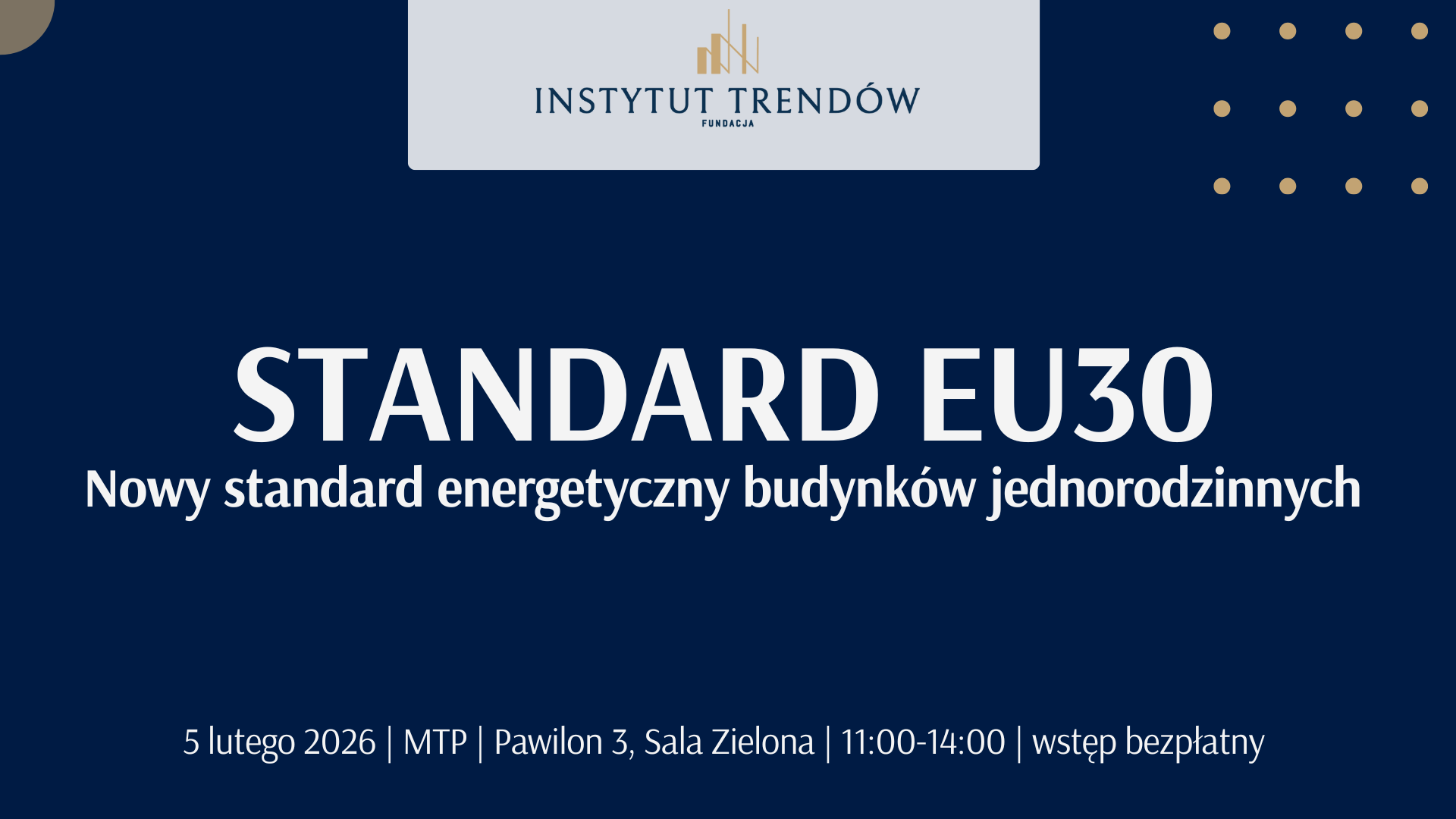 Krajowa Agencja Poszanowania Energii S.A. zaprasza na konferencję poświęconą prezentacji standardu EU30 – jednolitego standardu energooszczędnego domu jednorodzinnego, która odbędzie się podczas Targów Budma 5 lutego 2026 r. na Międzynarodowych Targach Poznańskich w Poznaniu (Pawilon 3, Sala Zielona, start o godz. 11:00). Celem wydarzenia jest przedstawienie wymagań technicznych i energetycznych standardu, omówienie zgodności EU30 z taksonomią UE, EPBD i standardami bankowymi oraz dyskusja o roli EU30 jako narzędzia ułatwiającego projektowanie, finansowanie i realizację nowoczesnych domów jednorodzinnych.