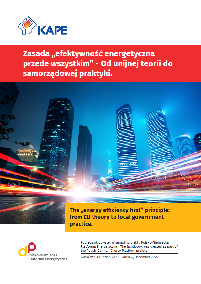 Krajowa Agencja Poszanowania Energii S.A. prezentuje publikację „Zasada „efektywność energetyczna przede wszystkim” - Od unijnej teorii do samorządowej praktyki.”, której celem jest analiza wdrażania zasady EE1st w kontekście podejmowania decyzji inwestycyjnych przez samorządy w obszarze transformacji energetycznej. Podręcznik wskazuje konkretne przypadki z polskich oraz niemieckich projektów związanych z poprawą efektywności energetycznej w lokalnych społecznościach. Publikacja powstała w ramach realizacji projektu Polsko-Niemiecka Platforma Energetyczna.